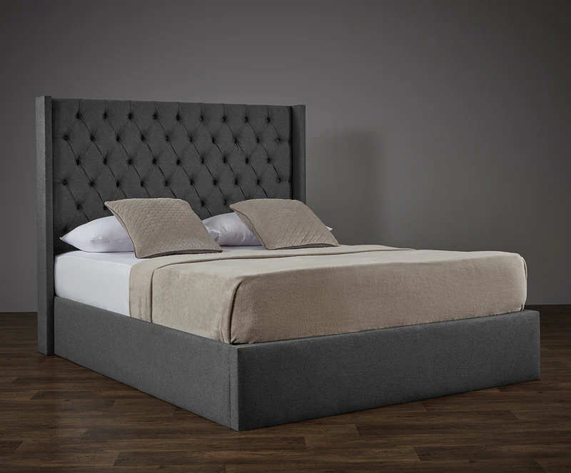 The Marley Bed features a distinctive design with a winged headboard adorned with classic Chesterfield buttons, creating a sophisticated and timeless aesthetic.